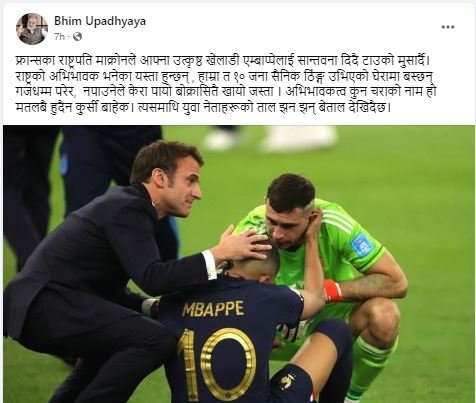 “फ्रान्सका राष्ट्रपति माक्रोनले आफ्ना उत्कृष्ठ खेलाडी एम्बाप्पेलाई सान्तवना दिदै टाउको मुसार्दै। राष्ट्रको अभिभावक भनेका यस्ता हुन्छन् , हाम्रा त १० जना सैनिक ठिंङ्ग उभिएको घेरामा बस्छन् गजधम्म परेर,