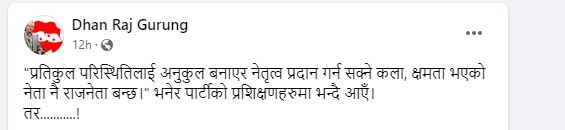 राजनेता हुन् । गुरुङले आफ्नो फेसबुकमा ” प्रतिकुल परिस्थितिलाई अनुकुल बनाएर नेतृत्व प्रदान गर्न सक्ने कला, क्षमता भएको नेता नै राजनेता बन्छ।”