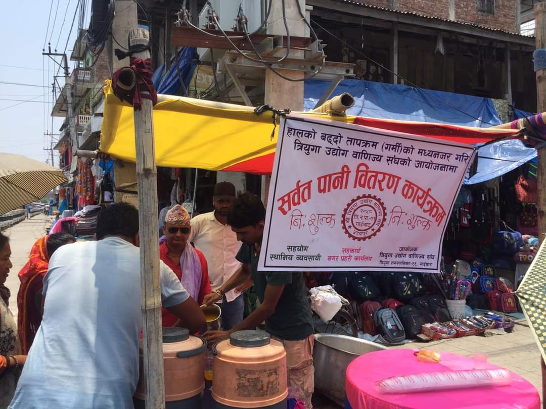 जेठ २५, गाईघाट / उदयपुर सदरमुकाम गाईघाटमा सर्वत पानी वितरन गरेको छ । त्रियुगा उधोग वाणिज्य संघ र स्थानीय व्यापारीको समन्वयमा निशुल्क बितरन गरेको हो ।