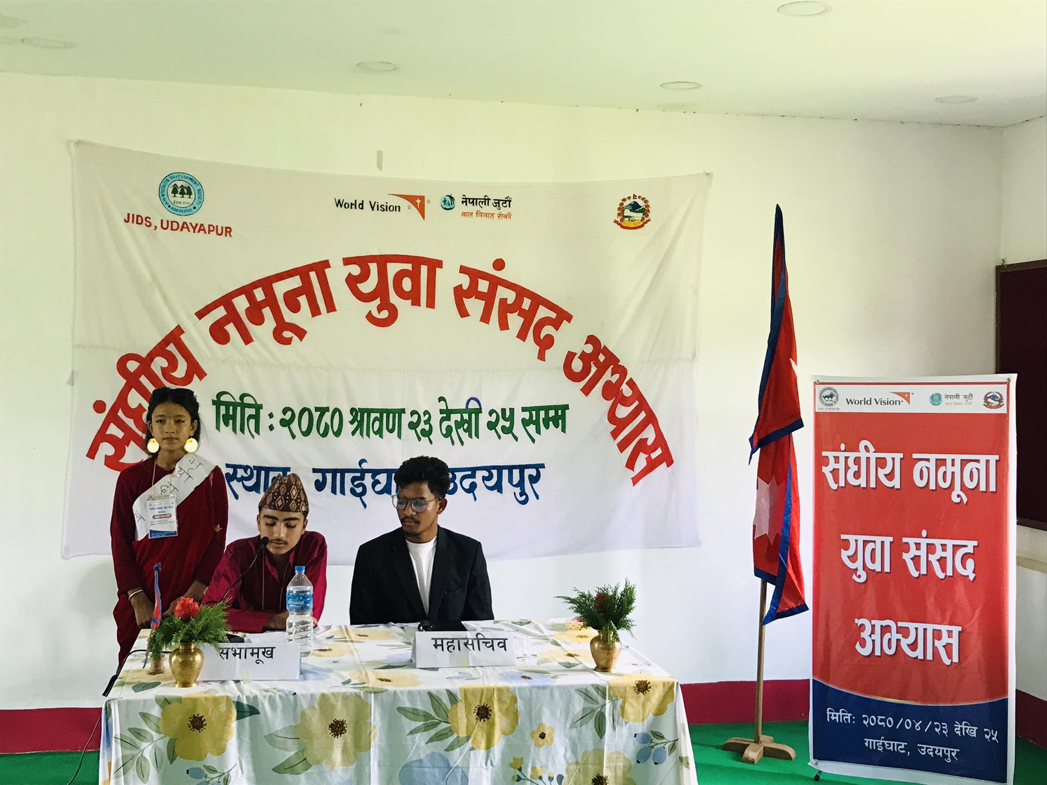 गाईघाट / जाल्पा एकीकृत बिकास समाज उदयपुर र वल्ड भिजन ईन्टरनेशनल नेपाल साझेदारीमा संचालित बाल स्पोन्सर्शिप परियोजनाको आयोजनामा ४ दिवसीय संघीय नमूना युवा संसद अभ्यास कार्यक्रम गाईघाटमा सम्पन्न भएको छ।