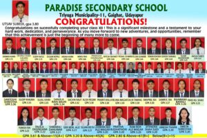 राष्ट्रिय परीक्षा बोर्डले साउन १९ गते सोमबार सार्वजनिक गरेको कक्षा १२ को नतिजामा उदयपुरको सदरमुकाम गाईघाट स्थित प्याराडाइज सेकेन्डरी स्कुलका १३६ जना विद्यार्थी उत्तीर्ण भएका छन् । प्याराडाइज सेकेन्डरी स्कुलका प्रिन्सिपल बाबुराम आचार्यका अनुसार जिपिए ३.६१ देखी ४ सम्म १५ जना , जिपिए ३.२१ देखी ३.६० सम्म ४५ जना , जिपिए २.८१ देखी ३.२० सम्म ६१ जना र जिपिए २.४१ देखी २.८० सम्म १५ जनाले ल्याउन सफल भएका छन् । यस स्कुलमा २०७६ सालबाट सुरु भएको कक्षा ११र१२ व्यवस्थापन विषयको पढाई संगै उत्कृष्ट नतिजा ल्याएको र कक्षा १० को एसईई परीक्षामा समेत जिल्लामा राम्रो नतिजा ल्याउदै आएको छ ।