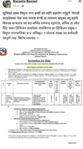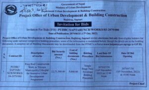 शहरी विकास तथा भवन निर्माण अफिस राजविराज सप्तरीले ठेक्का आह्वान गरेको छ । ठेक्कामा कार्तिक / ३० / २०७९ सम्म निर्वाण कम्पनीहरुले आवेदन दिन सक्कने जनाएको छ ।