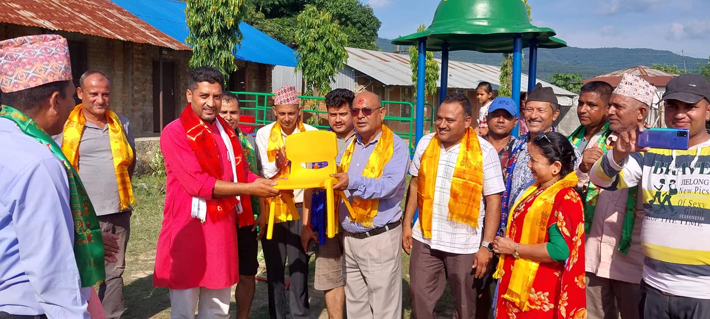 नगर प्रमुख बसन्त कुमार बस्नेतले बाल मैत्री सामग्री स्कुललाई हस्तान्तरण गर्दै